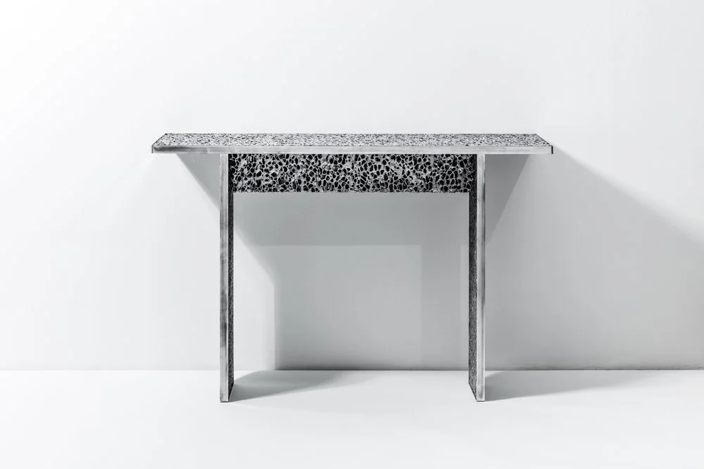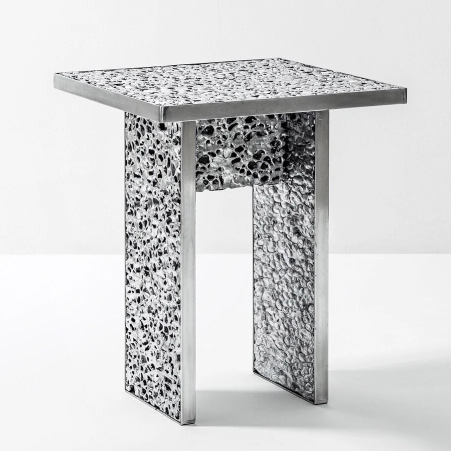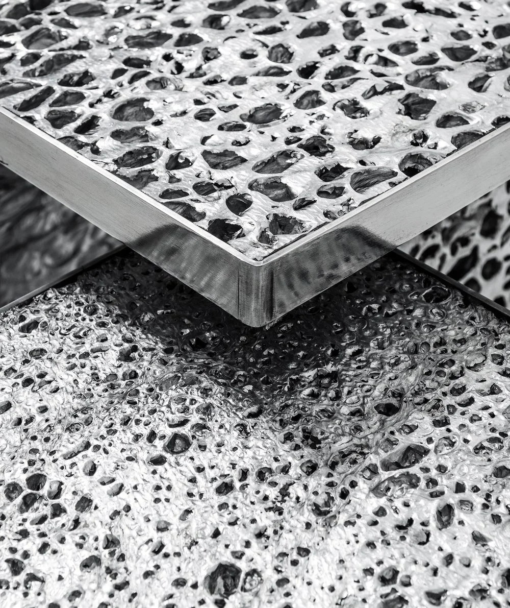 Alusion series includes a consolle and occasional tables, the collection is expanding to include a coffee table and low and tall shelvings. Architectural Stabilized Aluminium Foam is produced by injecting air into molten aluminium to create bubbles, the shiny silver skin of the large cell is then removed to expose the cells underneath.The visual language of the table is other-wordly, it is reminiscent of a natural sponge with a spatial accent. Keeping in mind the frail state of our planet and the ever-growing garbage pollution Alusion is produced with up to 50% recycled content and the material is 100% recyclable. This extremely light material makes the pieces easily maneuverable. The series can be utilized for both indoor and outdoor use.