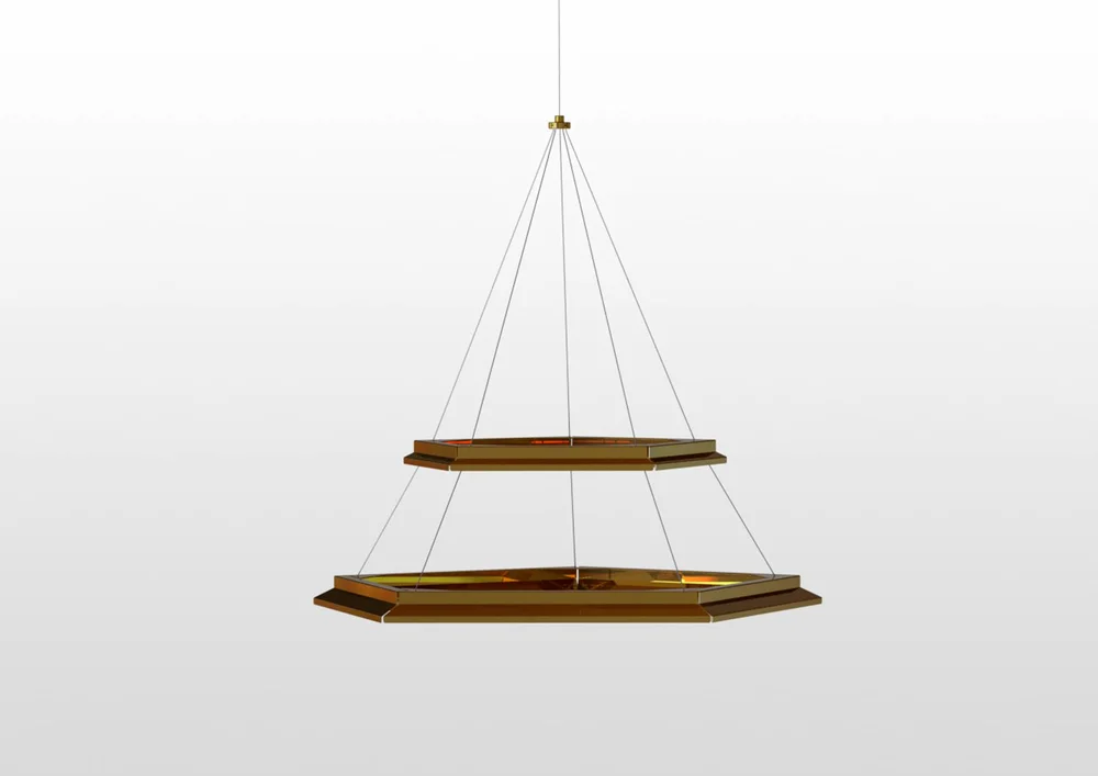 A two-tier structure consisting of two pentagons supported by steel cables. Each pentagon is created by assembling five identical laser-cut brass elements. The light source is composed of a sequence of linear LEDs connected in series.