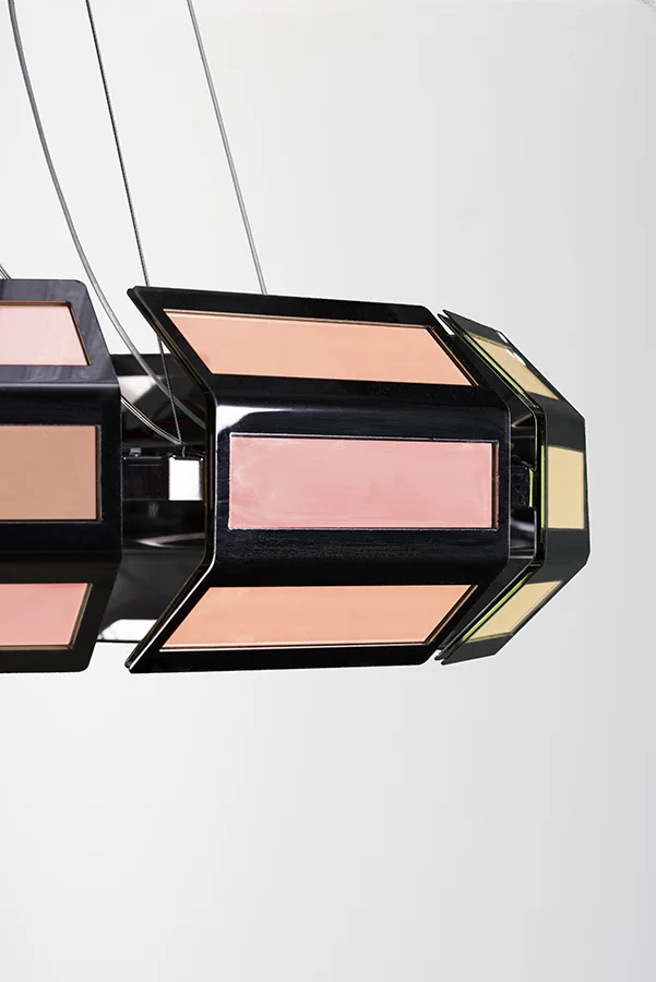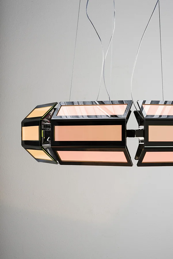 OLEDs are a new category of light sources that open totally innovative scenarios in the way we design and use light. Composed of light emitting diodes they exploit the quality of "organic” electronics and are formed of super thin films which are crossed by electrical currents that are able to emit light. The OLEDs used in Samantha have a reflective surface that gives the object a magical appearance, decorative and at the same time technical. Thanks to this feature the chandelier reflects the surrounding environment even when switched off creating an unexpected effect turning it into a very shiny object that almost feels alive. The stainless structure consists of three independent OLED modules that assembled in series allow to create different versions of the chandelier that can be adapted to specific requests both for private and contract customers. Samantha's name is a nod to the Italian astronaut Samantha Cristoforetti who immediately evokes a spirit of innovation and technological experimentation as well as a typical aesthetic dimension of the aerospace world where structure, electronics and volume are indivisible.