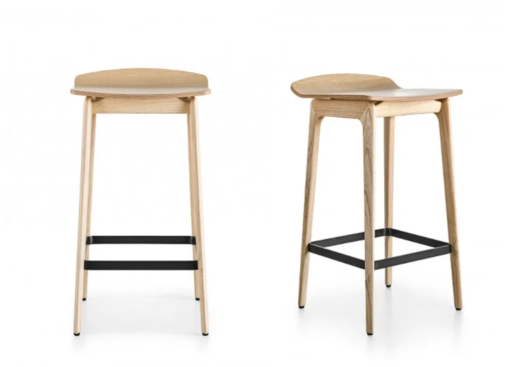 A solid wooden structure made of two finishes, natural ash and black stained ash, features harmoniously linked lines of the seat, also made of wood or covered with bonded hide leather. Pewter painted steel footrest. The totally and seamlessly jointed, screw-free construction produces a lightweight, organic effect.